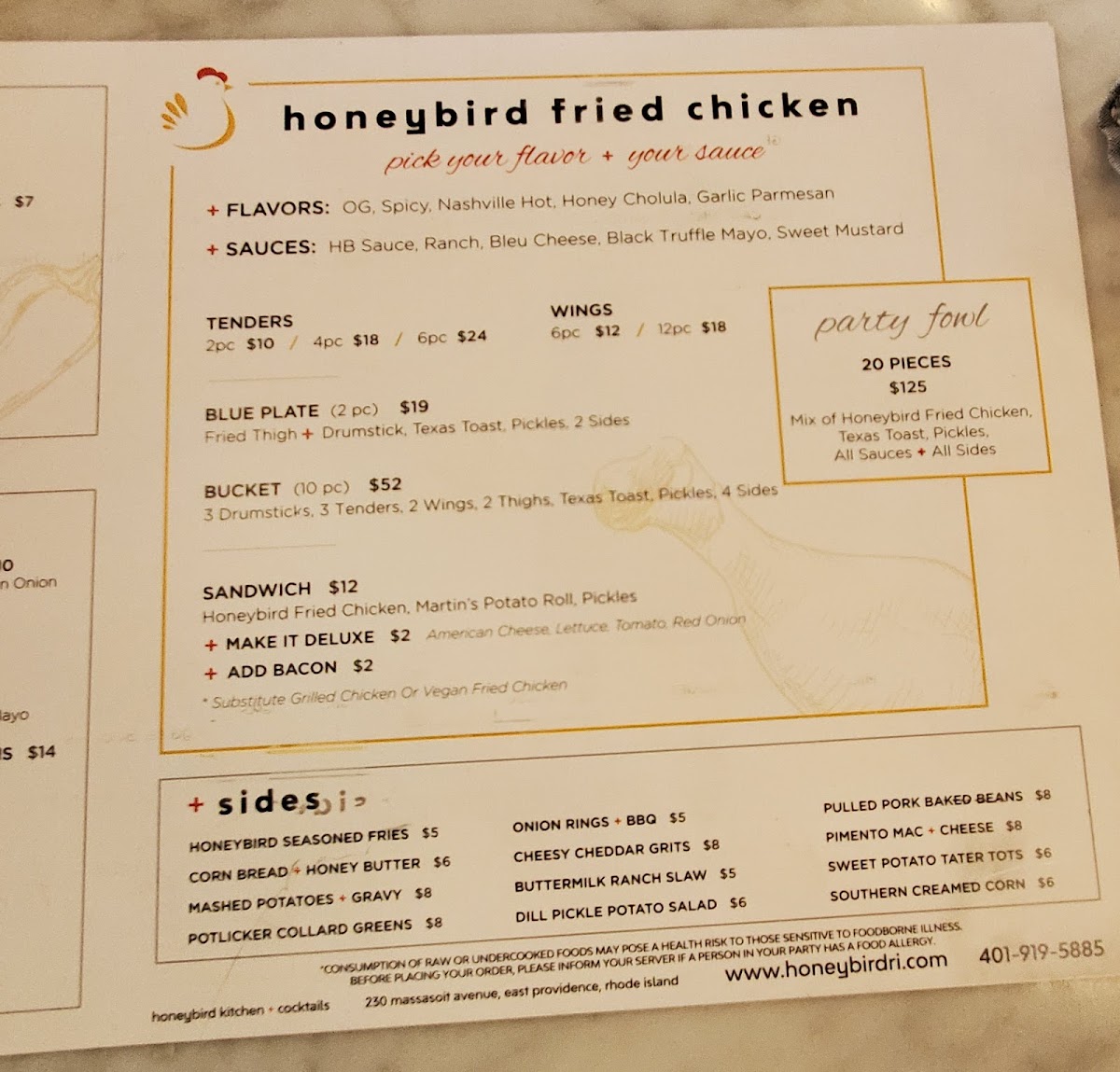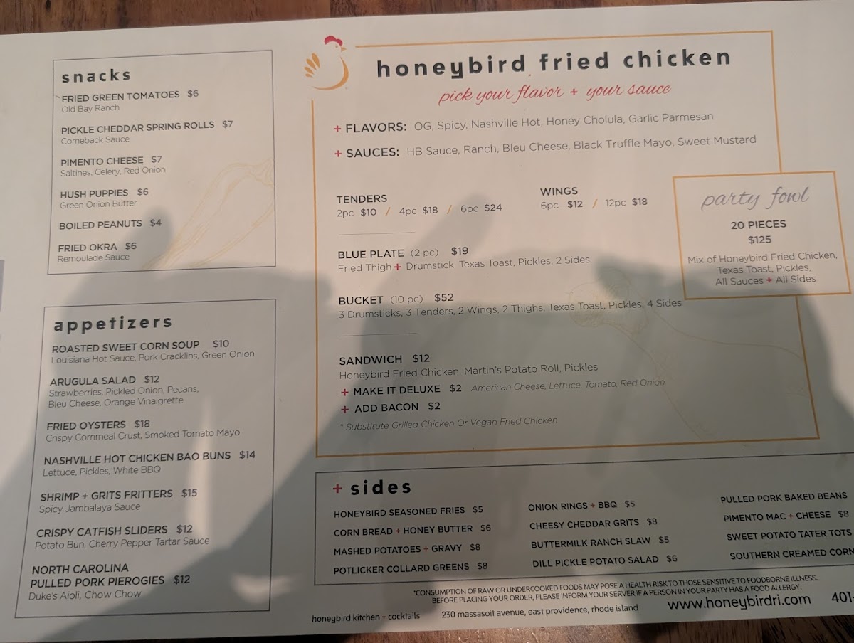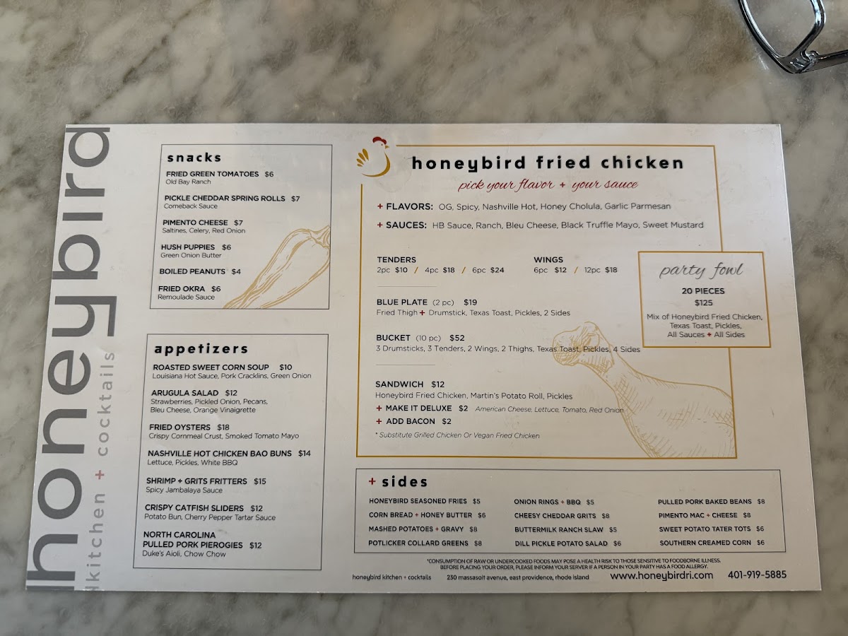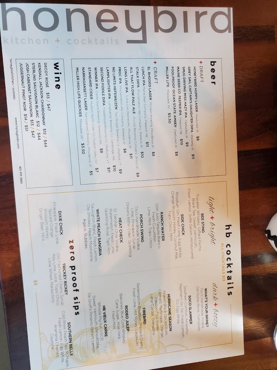Step into a cozy space where comfort food meets creativity with the Honeybird Menu. Located at 230 Massasoit Ave in East Providence, this spot offers a delightful selection that showcases fresh ingredients and mouthwatering flavors. From perfectly crispy chicken to hearty sides that elevate every bite, there's something here to satisfy every craving. Whether you're in the mood for a quick bite or a full meal, their menu has options that will make your taste buds sing. Each dish is crafted with care and the goal is simple-making you feel right at home. Don’t forget to check out the sweet treats that wrap up your meal perfectly.