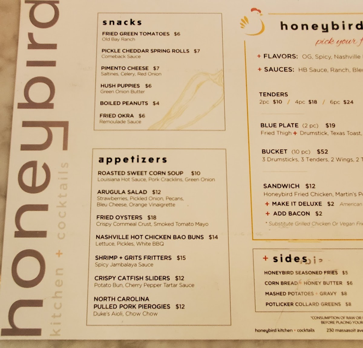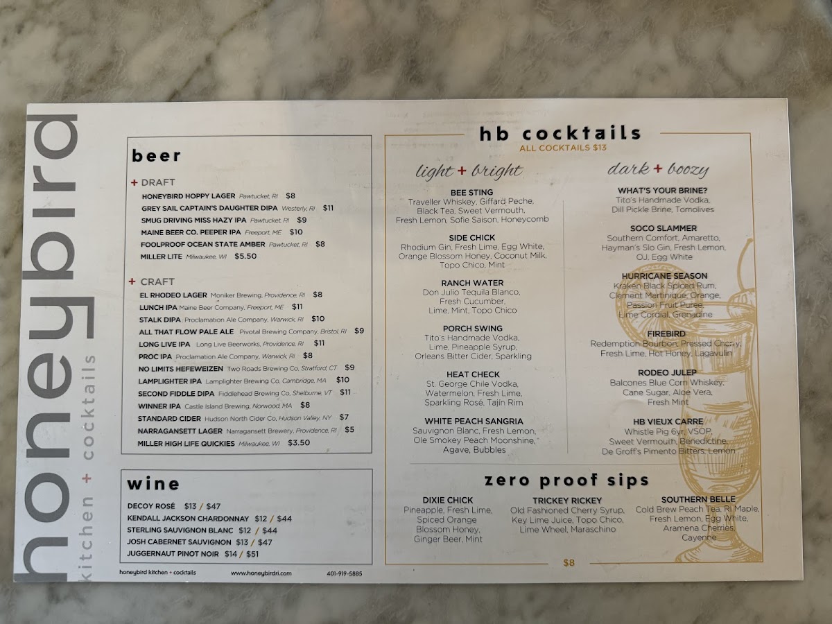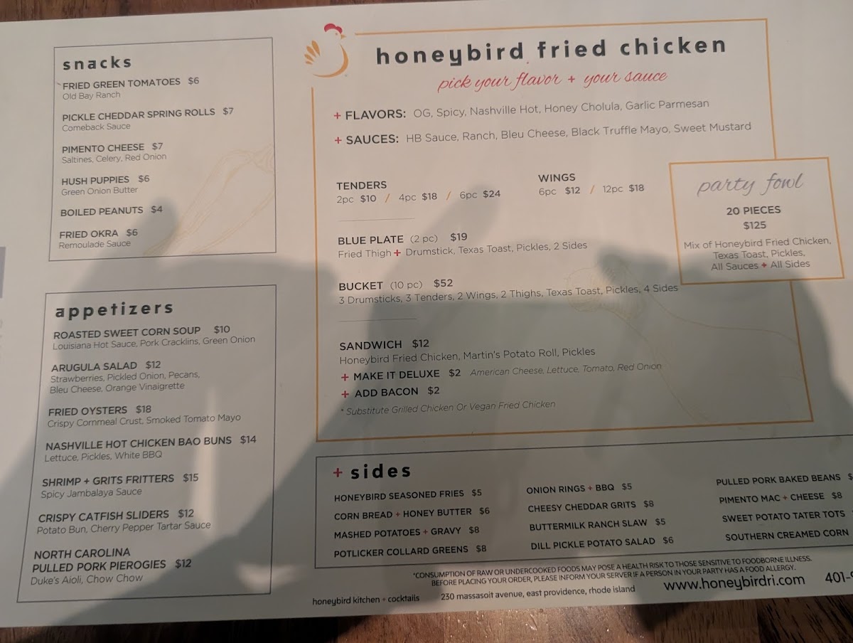Step into a cozy space where comfort food meets creativity with the Honeybird Menu. Located at 230 Massasoit Ave in East Providence, this spot offers a delightful selection that showcases fresh ingredients and mouthwatering flavors. From perfectly crispy chicken to hearty sides that elevate every bite, there's something here to satisfy every craving. Whether you're in the mood for a quick bite or a full meal, their menu has options that will make your taste buds sing. Each dish is crafted with care and the goal is simple-making you feel right at home. Don’t forget to check out the sweet treats that wrap up your meal perfectly.